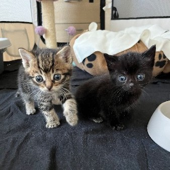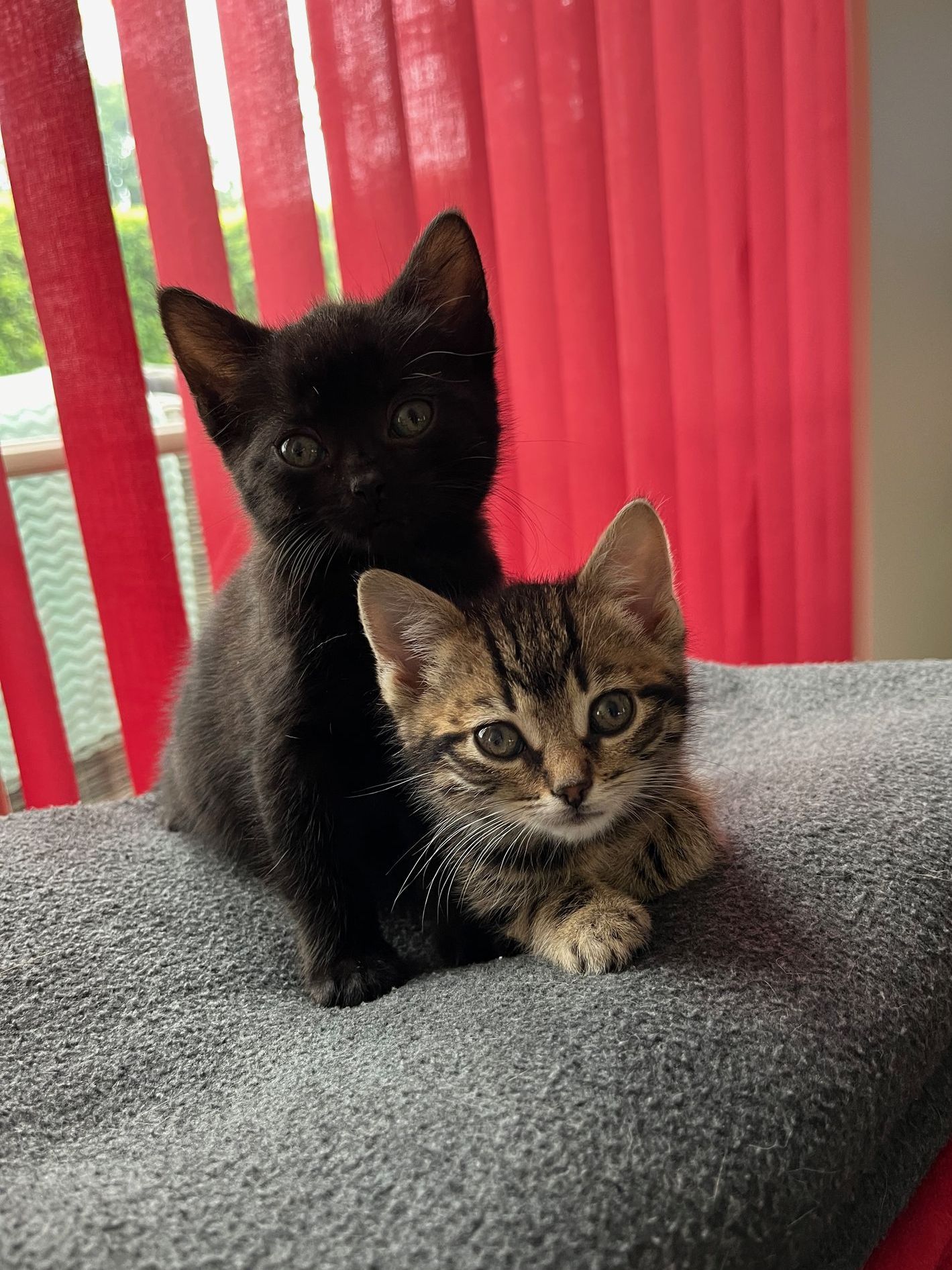 We hebben twee nieuwe kittens in opvang gekregen: zwarte Ziva en tijgertje Zendaya van ongeveer vier weken oud.