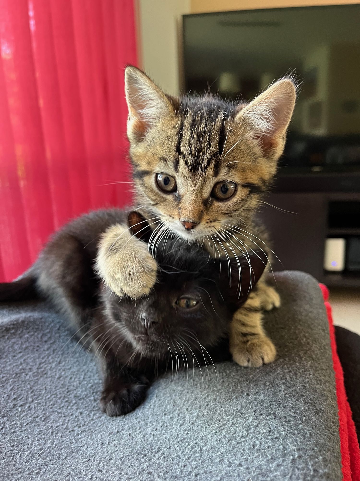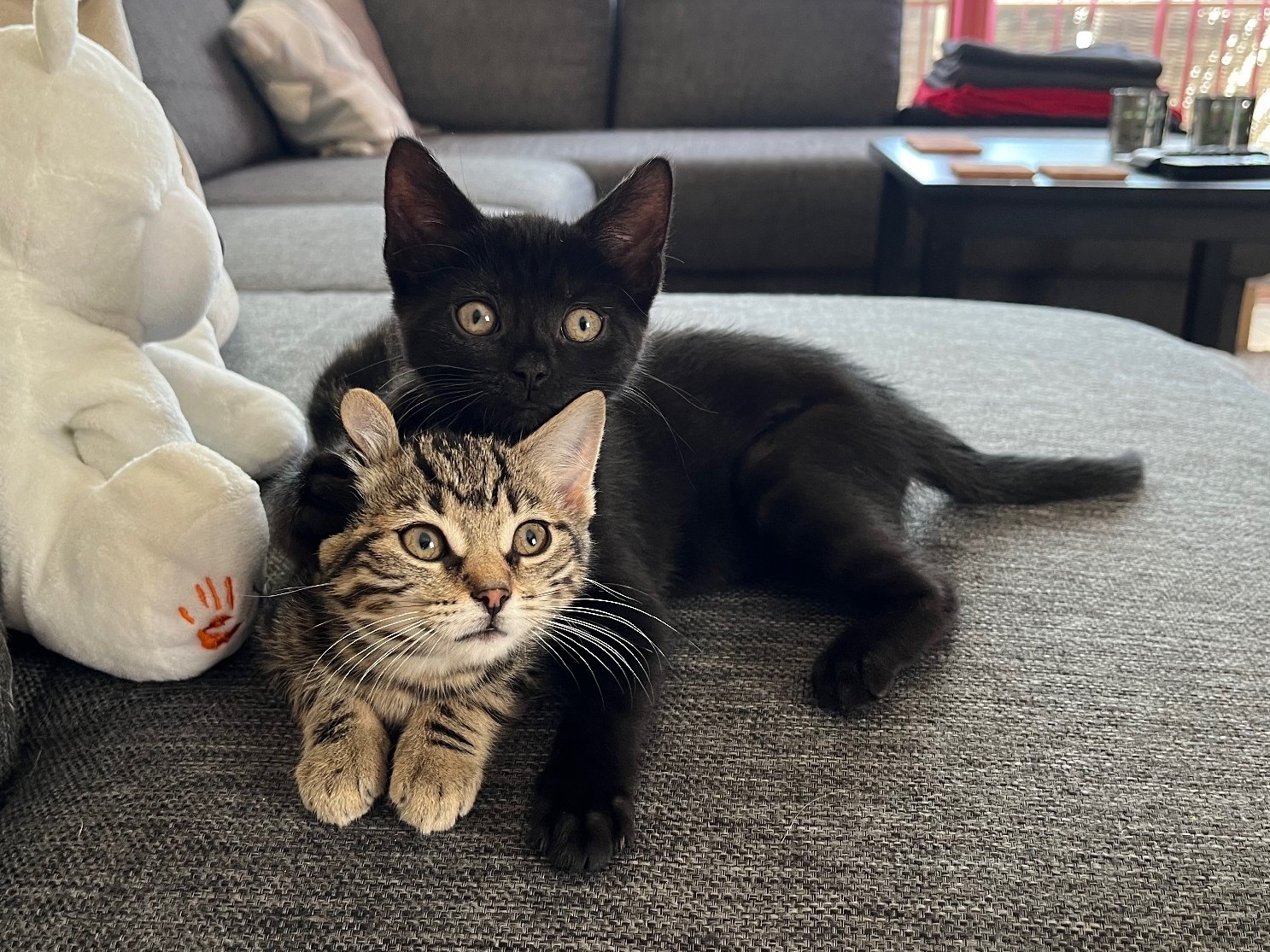 Ziva en Zendaya kwamen begin mei 2024 bij ons in opvang. Op een besmetting met giardia na hebben ze geen medische problemen gehad. Deze twee kittens ontpopten zich als ware knuffelbeertjes waar het hele gezin met volle teugen van heeft genoten! Hieronder staan alle blogposts over dit heerlijke duo.